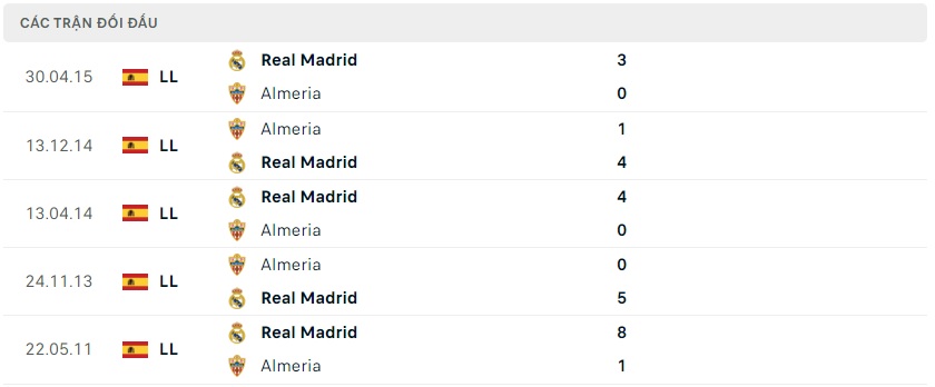 Thành tích đối đầu Almeria vs Real Madrid