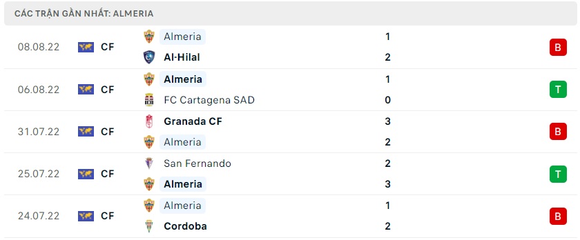 Phong độ gần đây Almeria