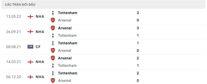 Thành tích đối đầu Arsenal vs Tottenham