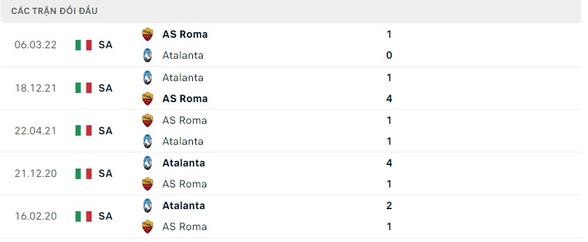 Thành tích đối đầu AS Roma vs Atalanta
