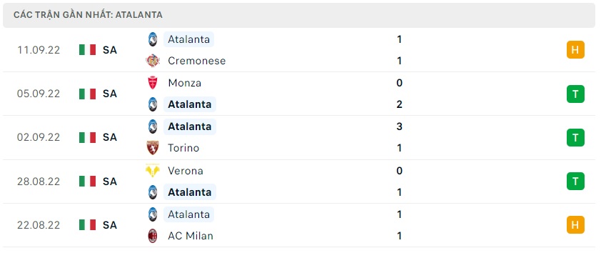 Phong độ gần đây Atalanta