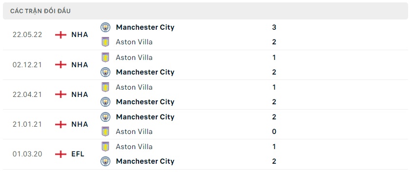 Thành tích đối đầu Aston Villa vs Manchester City