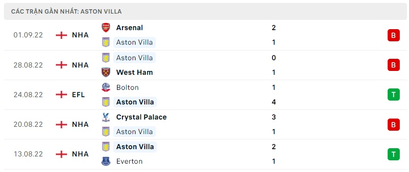 Phong độ gần đây Aston Villa