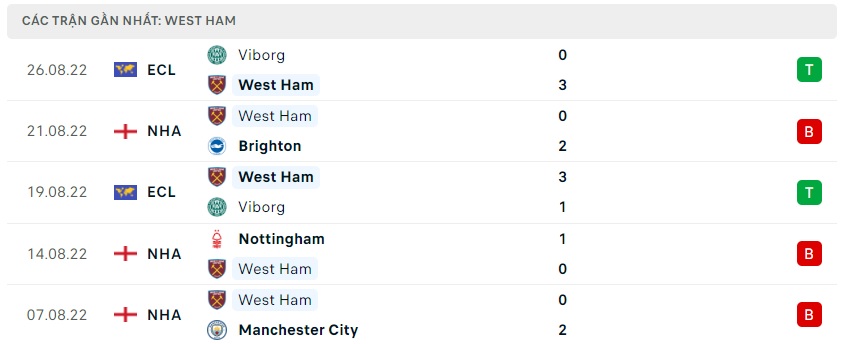 So với đối thủ thì West Ham thậm chí còn là cái tên để lại nhiều nỗi thất vọng hơn cho người hâm mộ, sau loạt trận giao hữu không mấy thành công thì Búa Tạ đã liên tiếp trượt chân trong cả 3 trận mở màn đã qua của Premier League. Vị trí bét bảng là thành tích xứng đáng cho màn trình diễn nhạt nhoà của thầy trò HLV David Moyes, nhưng chiến thắng trước Viborg ở sân chơi C3 với tổng tỷ số 6-1 sẽ cho phép West Ham có được sự tự tin nhất định trong lần trở về sân chơi số 1 Xứ Sương Mù lần này.