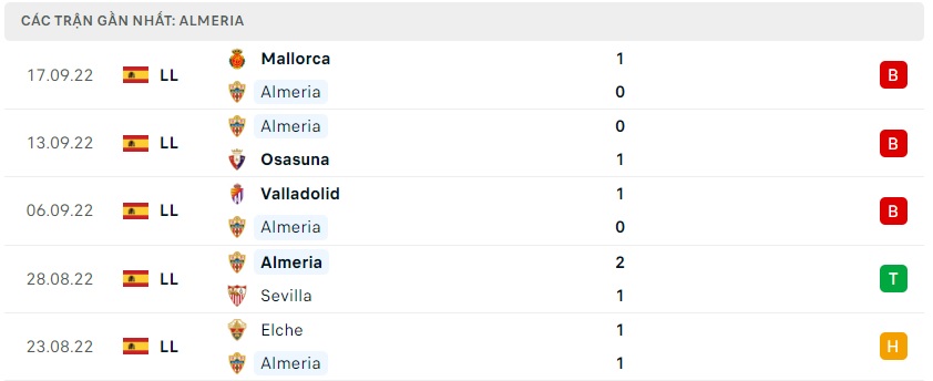 Còn với Almeria họ đang thể hiện năng lực yếu kém của một tân binh vừa mới quay trở lại La Liga mùa này, thất bại trước Mallorca mới đây là trận thua thứ 3 liên tiếp mà Almeria phải nhận. Thành tích sau 6 vòng đấu mùa này Almeria mới chỉ thắng 1, hòa 1 và thua tới 4 vòng đấu khiến họ hiện nay chỉ đang xếp ở vị trí thứ 16 trên bảng xếp hạng. Almeria sẽ đối mặt với rất nhiều khó khăn cho mục tiêu trụ hạng của mình tại giải đấu.