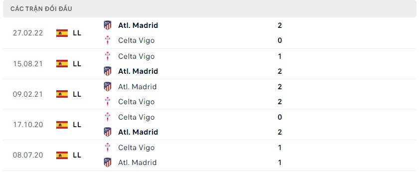 Thành tích đối đầu Atletico Madrid vs Celta Vigo