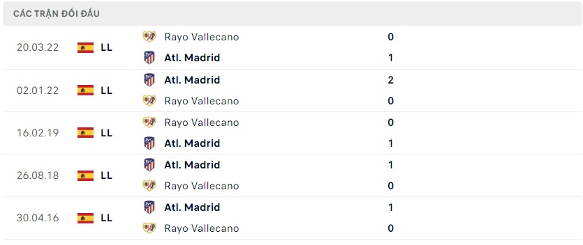 Thành tích đối đầu Atletico Madrid vs Rayo Vallecano