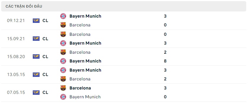 Thành tích đối đầu Bayern Munich vs Barcelona