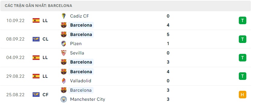 Ở chiều ngược lại Barcelona có trận thắng dễ dàng Cadiz với 4 bàn thắng ghi được, đây là chiến thắng thứ 4 liên tiếp của thầy trò HLV Xavi có được tại La Liga mùa giải năm nay sau 5 lượt trận đấu. Đấu trường Champions League thì Barcelona chỉ gặp Viktoria Plzen ở vòng đấu mở màn, chiến thắng 5-1 khá dễ dàng đã cho thấy được sức mạnh của đội chủ sân Camp Nou ở mùa giải năm nay.