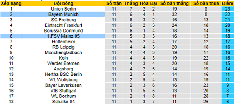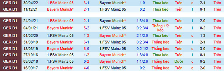 Đội Bayern Munich hiện đang vượt trội hoàn toàn so với đối thủ Mainz về thành tích đối đầu trong quá khứ. Nhưng khá bất ngờ khi ở 3 lần thi đấu gần nhất giữa 2 đội thì chính Mainz mới là đội giành ưu thế với 2 chiến thắng. Đây là trận đấu mà đội Bayern Munich được đánh giá khá vượt trội về mọi mặt nhưng trước một đối thủ rất khó chịu như đội Mainz, họ sẽ không dễ để đội chủ nhà giành được 3 điểm trọn vẹn.