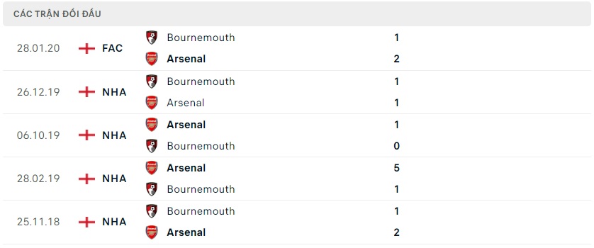 Thành tích đối đầu Bournemouth vs Arsenal