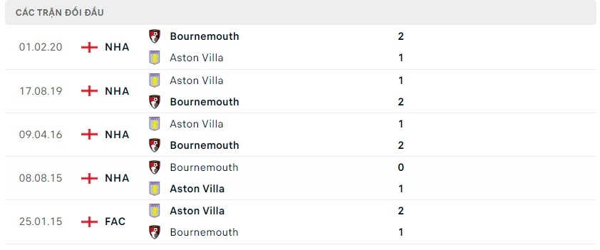 Thành tích đối đầu Bournemouth vs Aston Villa