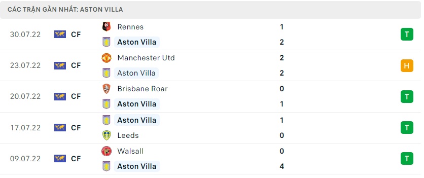 Phong độ gần đây Aston Villa