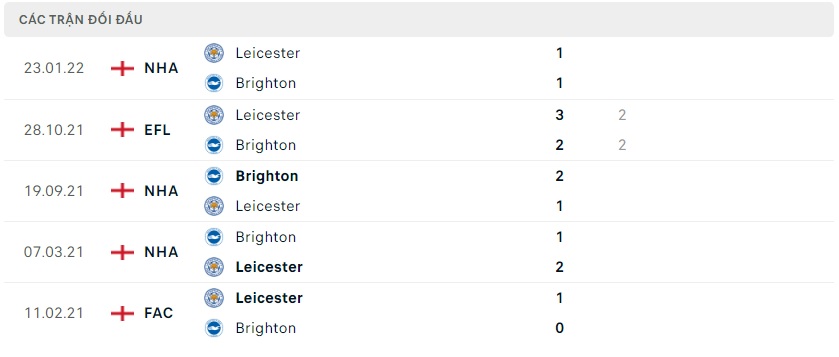 Thành tích đối đầu Brighton vs Leicester City