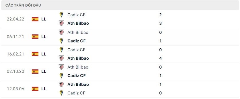 Thành tích đối đầu Cadiz vs Athletic Bilbao