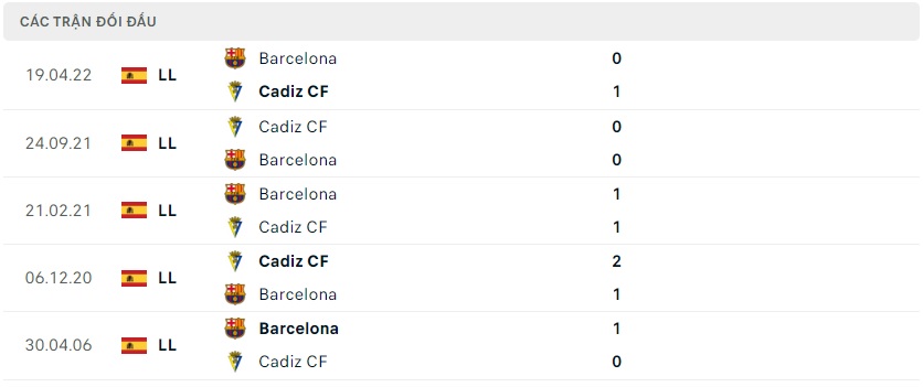 Thành tích đối đầu Cadiz vs Barcelona
