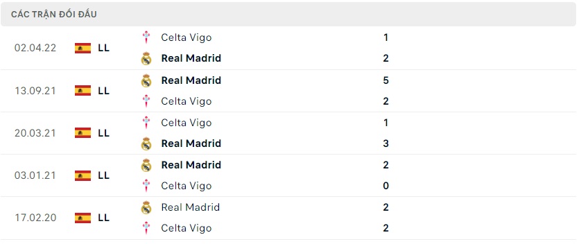 Thành tích đối đầu Celta Vigo vs Real Madrid