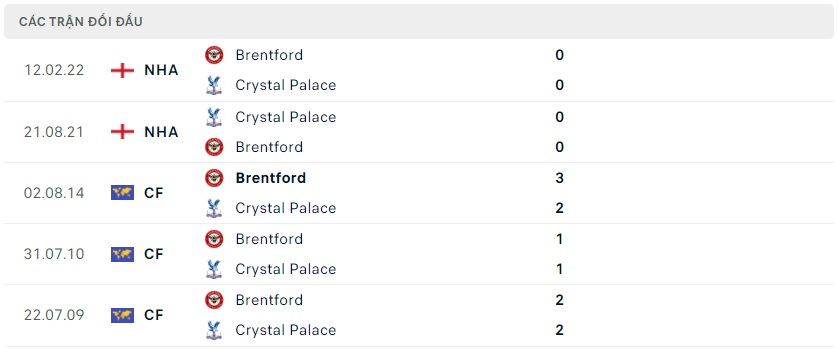 Ở mùa giải trước giữa Crystal Palace đều bất phân thắng bại trong cả 2 lượt trận đi và về, xa hơn thế thì 5 lần gặp nhau hai đội Brentford vẫn chưa từng để thua Crystal Palace, sự cân bằng của hai đội có thể thấy được với 4 trận gặp nhau hòa kèo châu Âu cả trận, do đó mà khả năng bất phân thắng bại của hai đội ở vòng 5 Premier League mùa này là điều xảy ra.