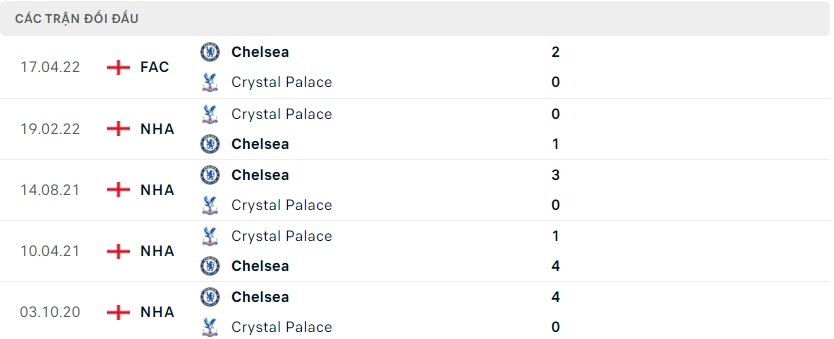 Thành tích đối đầu Crystal Palace vs Chelsea