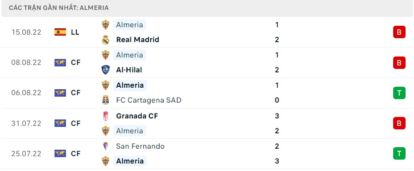 Về phía Almeria họ đã nhạn thất bại 1-2 trước Real Madrid tại vòng đấu ra quân vừa qua của mình, thất bại là không quá đáng trách với Almeria bởi họ vừa phải đương đầu với nhà vô địch giải đấu. Điểm sáng với Almeria ở vòng đấu đầu tiên chính là việc vươn lên dẫn trước Real Madrid và một thế trận không tệ, nếu duy trì được phong độ này tân binh La Liga hoàn toàn có thể hy vọng tới những kết quả tốt phía sau.