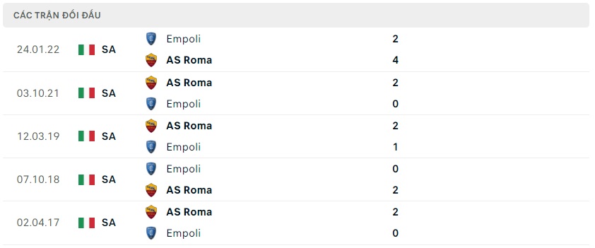 Thành tích đối đầu Empoli vs AS Roma