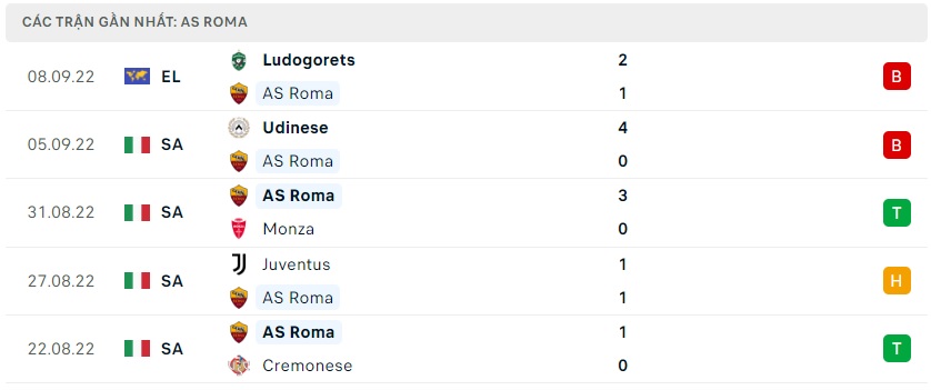 Phong độ gần đây AS Roma
