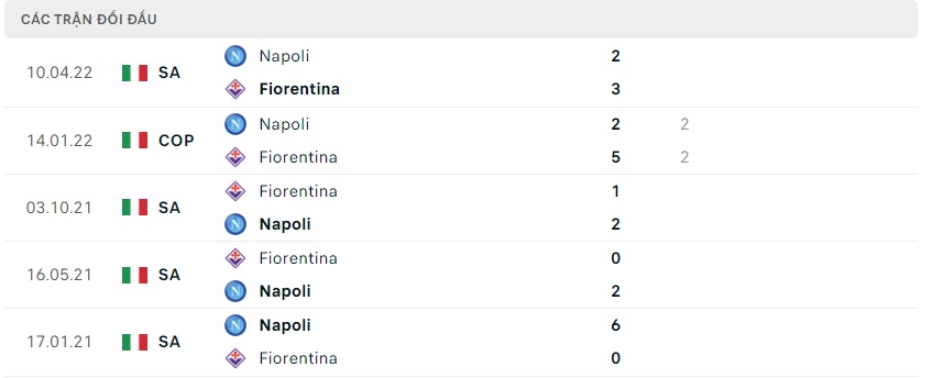 Thành tích đối đầu Fiorentina vs Napoli