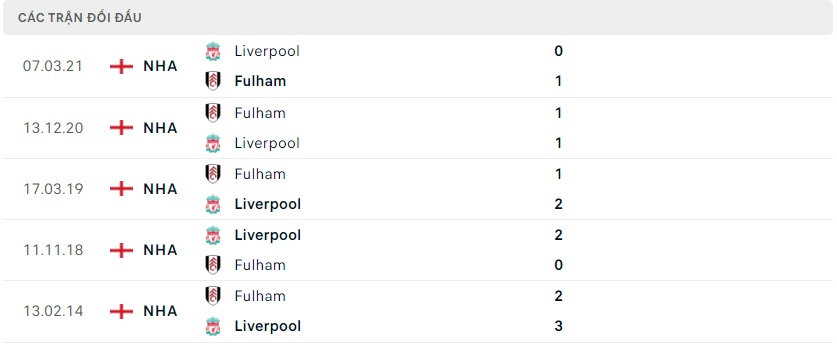 Thành tích đối đầu Fulham vs Liverpool