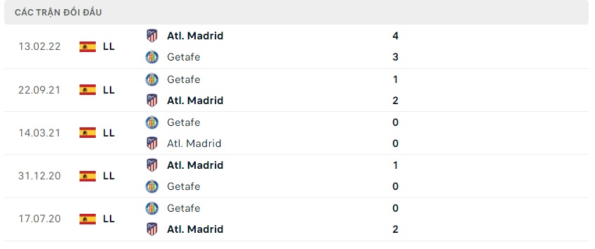 Thành tích đối đầu Getafe vs Atletico Madrid