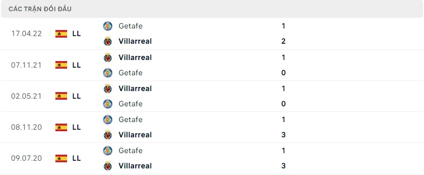 Thành tích đối đầu Getafe vs Villarreal