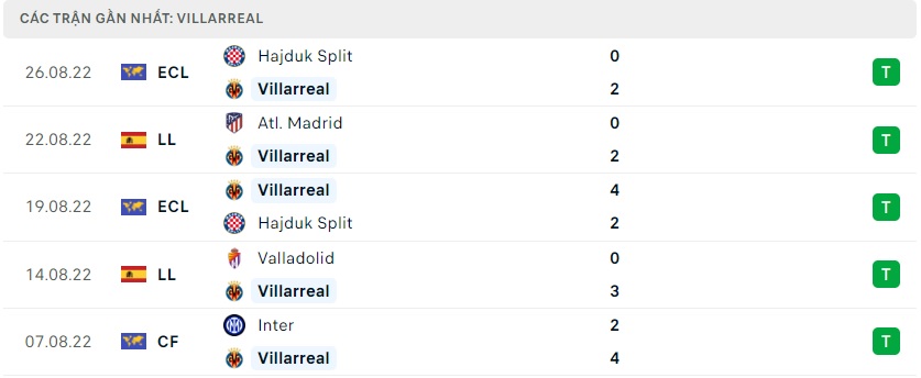 Phong độ gần đây Villarreal