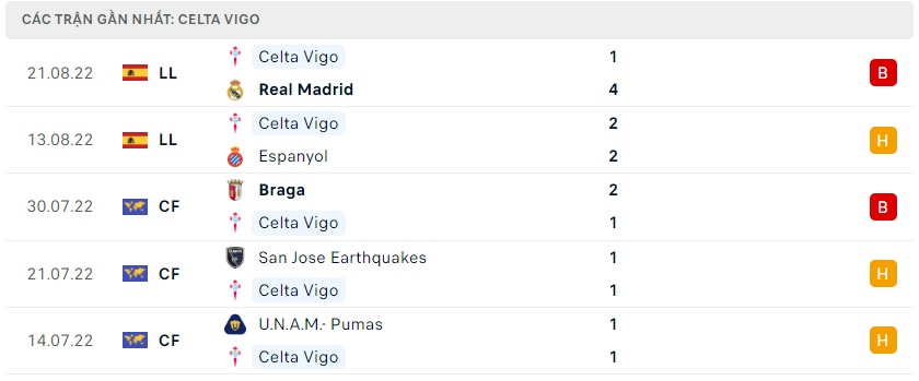 Phong độ gần đây Celta Vigo