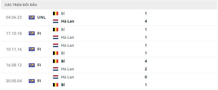 Thành tích đối đầu Hà Lan vs Bỉ