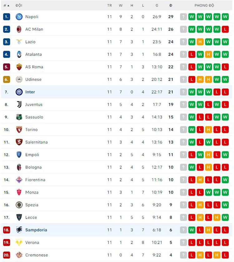 Sau 3 trận đấu chỉ hòa và thua gần đây thì đội bóng Sampdoria cuối cùng cũng đã có một trận chiến thắng ở vòng đấu vừa qua Cremonese và đó cũng là trận chiến thắng đầu tiên của Sampdoria ở mùa giải này. Sau tổng 11 vòng đấu, Sampdoria hiện chỉ có được 6 điểm và đang xếp thứ 3 từ dưới lên trên BXH.