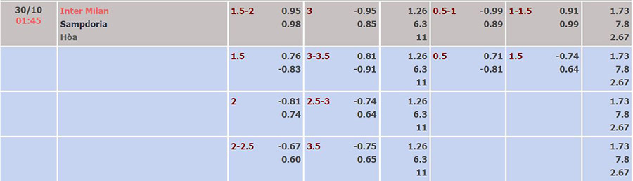 Tỷ lệ kèo Inter Milan vs Sampdoria