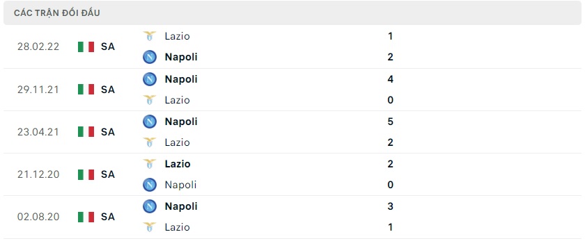 Thành tích đối đầu Lazio vs Napoli