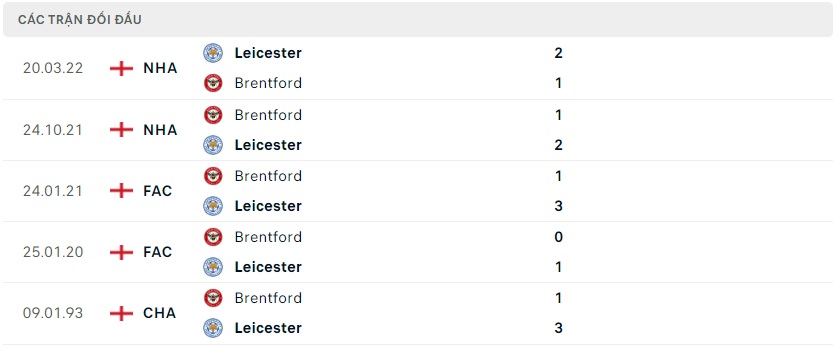 Bảng tỷ lệ kèo trận đấu Leicester vs Brentford