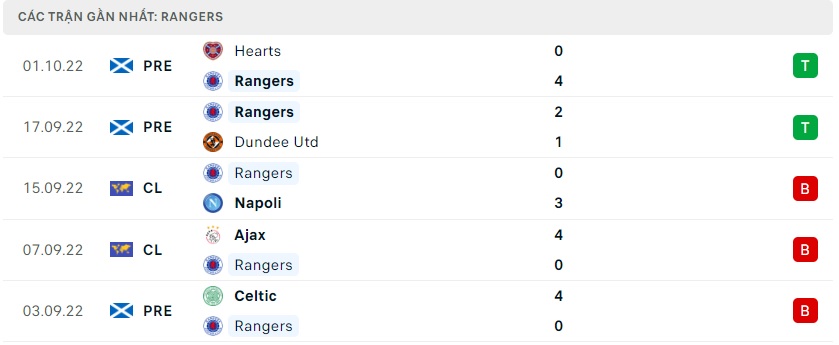 Phong độ gần đây Rangers FC