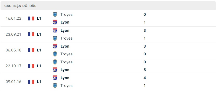 Thành tích đối đầu Lyon vs Troyes
