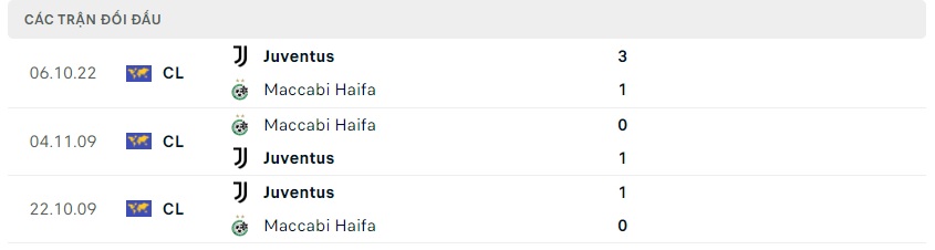 Thành tích đối đầu Maccabi Haifa vs Juventus