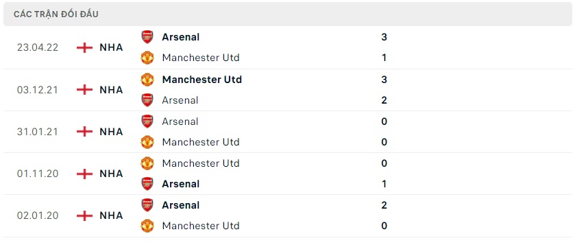 Thành tích đối đầu Manchester United vs Arsenal