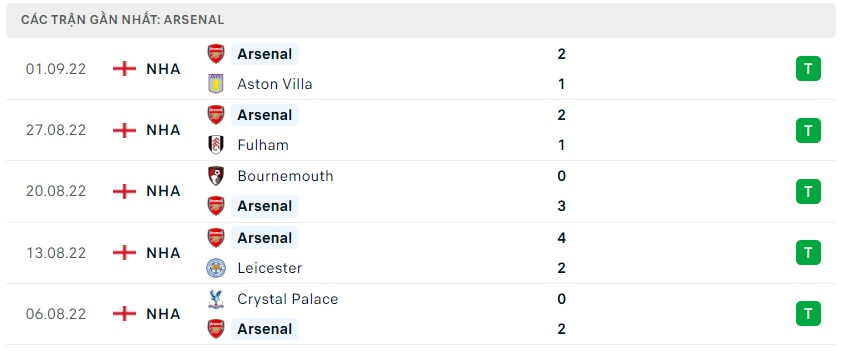 Còn với Arsenal họ vẫn đang cho thấy được rất nhiều thành công ở đầu mùa giải năm nay, trận thắng 2-1 trước Aston Villa mới đây là chiến thắng thứ 5 mà Pháo thủ có được ở mùa giải này. 15 điểm tuyệt đối sau 5 lượt trận đang giúp thầy trò HLV Mikel Arteta độc chiếm ngôi đầu bảng xếp hạng. Đội bóng thành phố London đang có được 2 điểm nhiều hơn nhà đương kim vô địch giải đấu Manchester City xếp thứ 2.
