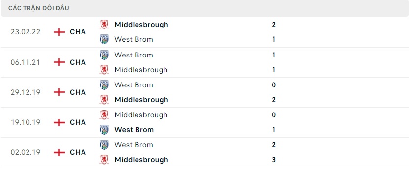 Thành tích đối đầu Middlesbrough vs West Bromwich