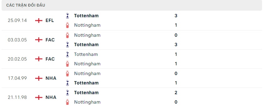 Thành tích đối đầu Nottingham vs Tottenham