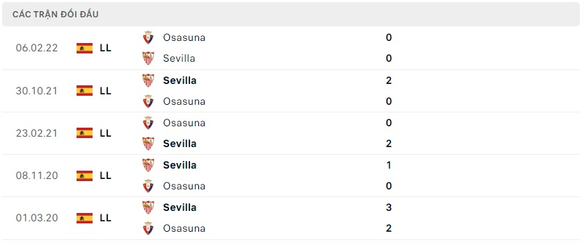 Thành tích đối đầu Osasuna vs Sevilla