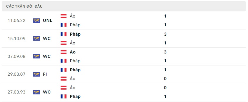 Thành tích đối đầu Pháp vs Áo