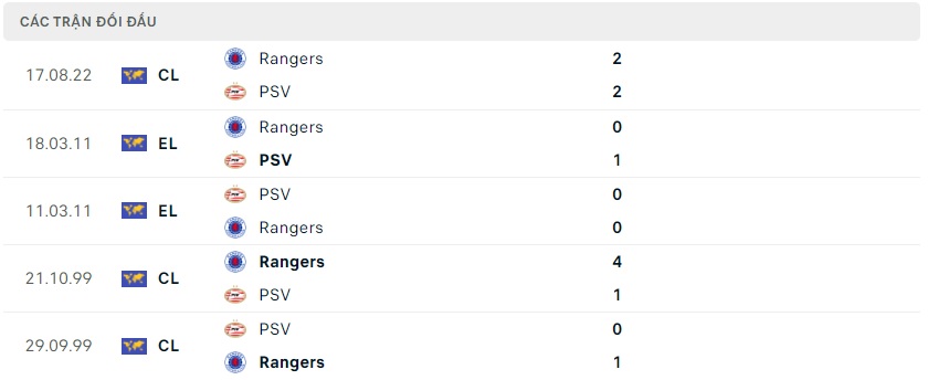 Thành tích đối đầu PSV Eindhoven vs Rangers