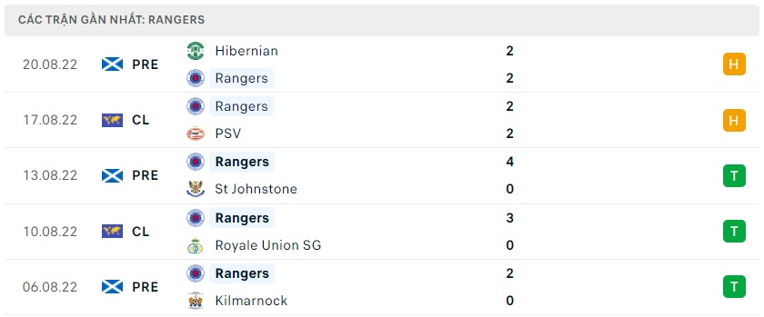 Phong độ gần đây Rangers