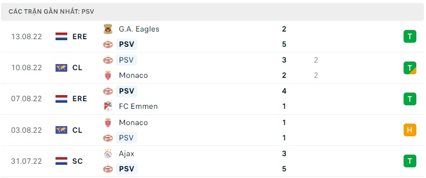 Phong độ gần đây PSV Eindhoven
