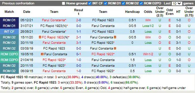 Trong quá khứ các vị khách Farul Constanta đang là những đội bóng chiếm được ưu thế khi mà họ thắng 2 hoà 2 và chỉ để thua 1 trong 5 trận dấu gần nhất chạm trán với đội chủ nhà Rapid Bucuresti. Có thể thấy cơ hội vượt ải handicap của các vị khách Rapid Bucuresti đang là rất cao.